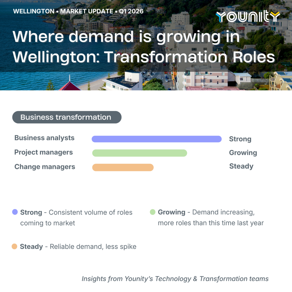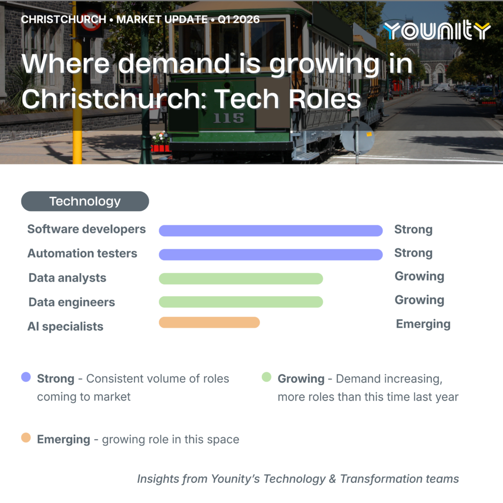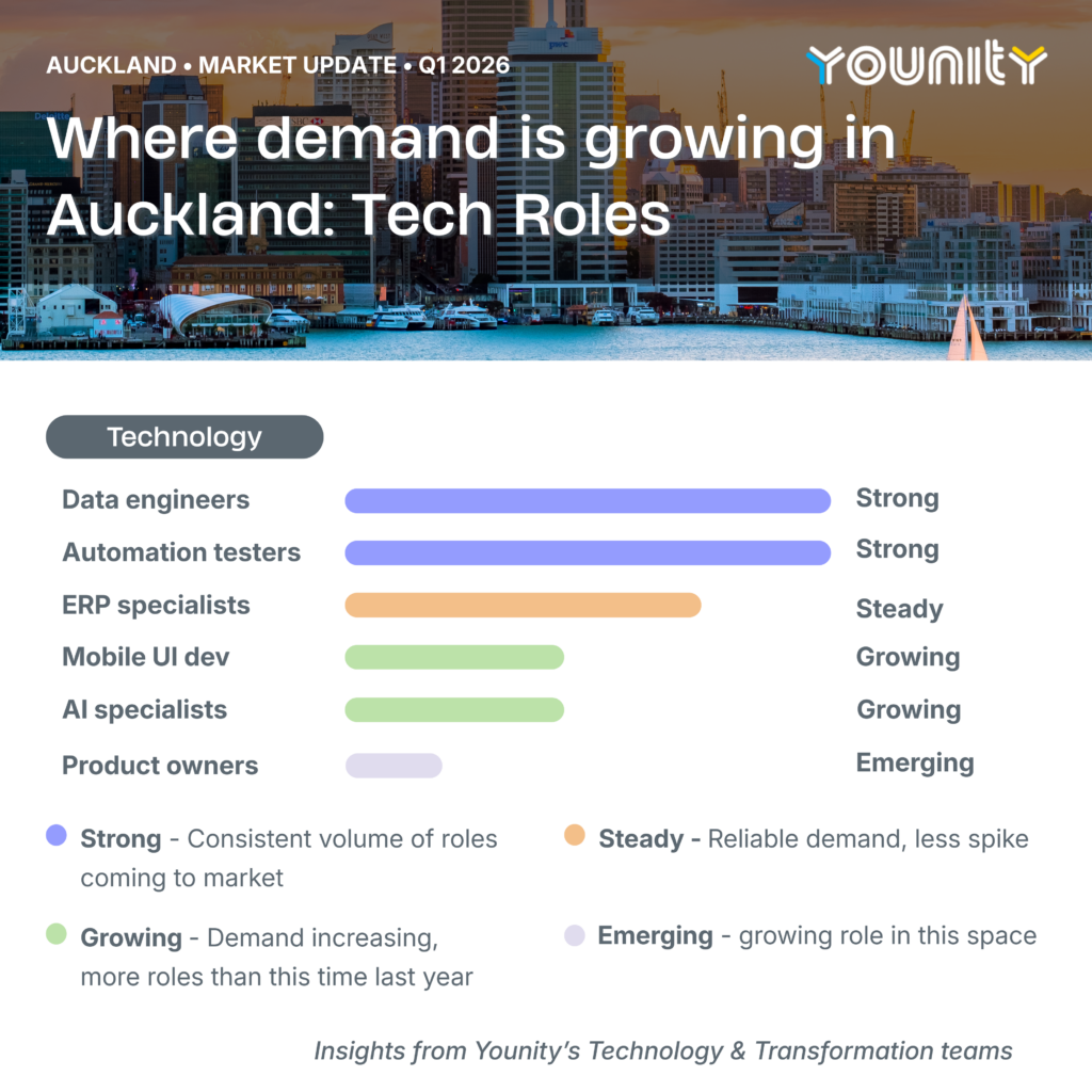 Younity is a specialist IT recruitment consultancy with teams across Auckland, Wellington, and Canterbury. If you want an honest, no pressure conversation about how your skills fit the current market, we are always happy to talk.