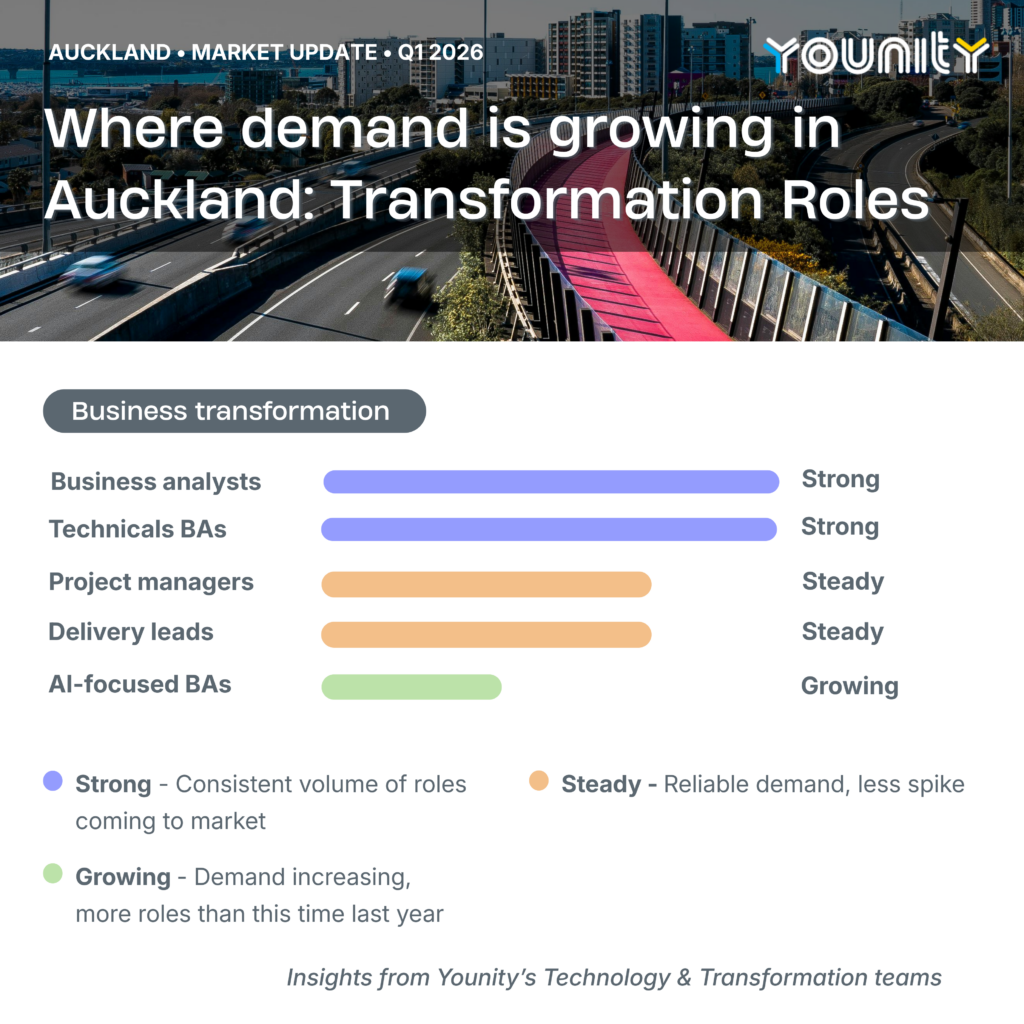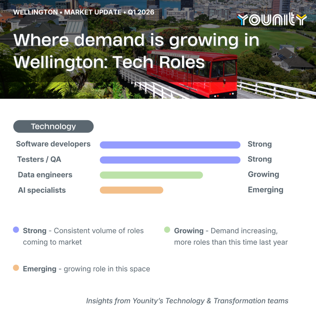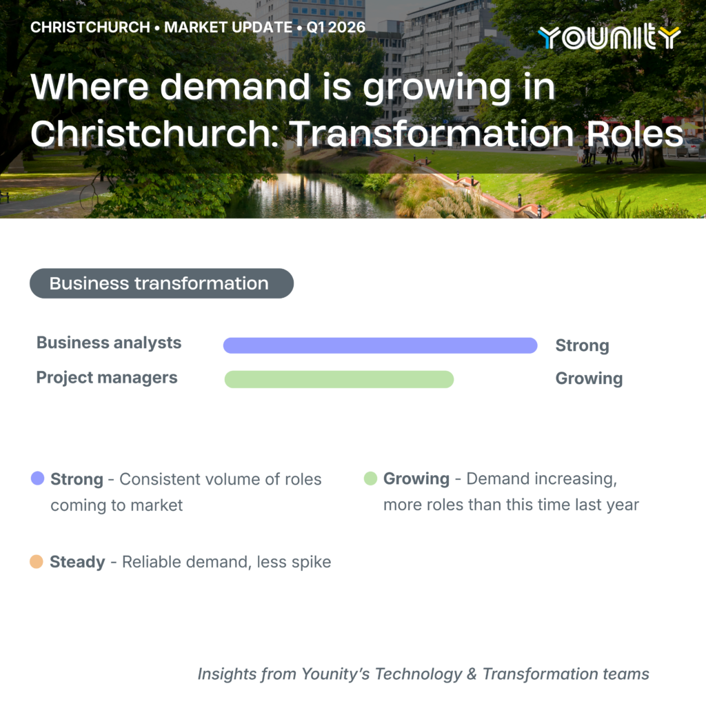 Younity is a specialist IT recruitment consultancy with teams across Auckland, Wellington, and Canterbury. If you want an honest, no pressure conversation about how your skills fit the current market, we are always happy to talk.